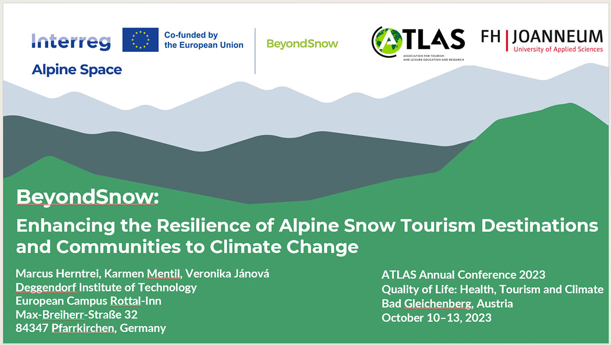 The BeyondSnow project was presented at the ATLAS Annual Conference 2023 under the motto “Quality of Life: Health, Tourism and Climate”. The presentation was included in the Special Track “Climate Change and Tourism – Quality of Life, Well-Being, Climate Change: Bridging the Theory-Action Gap”. Alongside the theoretical introduction to the research topic and fundamental information about the project, the focus was placed on the project’s methodology, the contemporary “work in progress”, and the intended outcomes – in particular, the Resilience Adaptation Model, Resilience Decision-Making Digital Tool, and PWA Transition Strategies. The ATLAS Annual Conference was held in a hybrid mode; five participants joined the special track online, 25 participants were present on-site at the conference venue in Bad Gleichenberg, Austria.