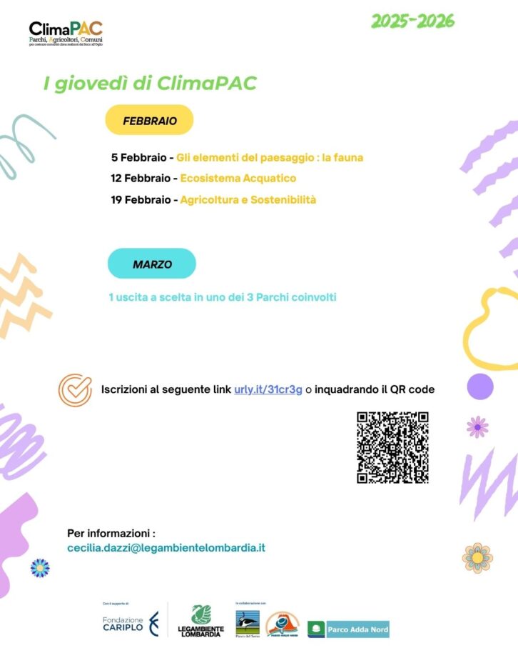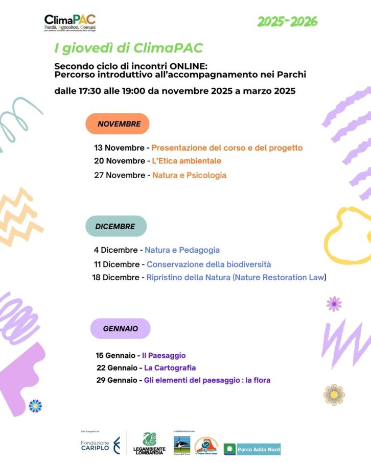 Il corso fa parte delle azioni del progetto “ClimaPAC: Parchi, Agricoltori, Comuni per costruire comunità clima-resilienti dal Serio all’Oglio” di Legambiente Lombardia con il contributo di Fondazione Cariplo.