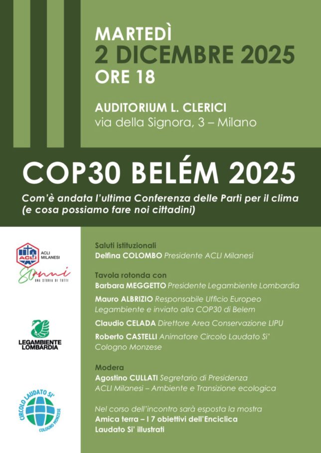 COP30 Belém 2025 Com’è andata l’ultima Conferenza delle Parti per il clima (e cosa possiamo fare noi cittadini) + Aggiungi a Google Calendar + iCal / Outlook export Data 02 Dic 2025 Expired! Ora 18:00 Luogo Auditorium L. Clerici Via delle Signora 3, Milano Altri luoghi Milano Organizzatore Legambiente Lombardia Telefono 0287386480 Email lombardia@legambientelombardia.it Sito web https://www.legambientelombardia.it/ Prossimo evento Innamorati della natura Data Feb 14 2026 Ora 14:30 - 17:30 Condividi questo evento