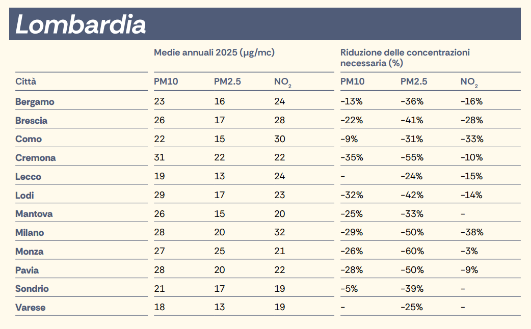 Oltre ai parametri in vigore sui limiti giornalieri per il PM10 (50 microgrammi per metro cubo per un massimo di 35 giorni all’anno) le tabelle lombarde di Mal’Aria prendono in considerazione anche i limiti della nuova direttiva, da raggiungere entro il 2030, valori decisamente più stringenti degli attuali (20 µg/m³ per PM10, 20 µg/m³ per l’NO2, 10 µg/m³ per PM2.5) e per rispettare i quali servirà un deciso cambio di marcia. Il dossier Mal’Aria indica le riduzioni necessarie a perseguire i nuovi limiti, con evidenti ritardi da colmare quanto prima. Solo Lecco e Varese per il PM10, e Mantova, Sondrio e Varese per l’NO2, sono su una traiettoria coerente con i traguardi europei di qualità dell’aria.