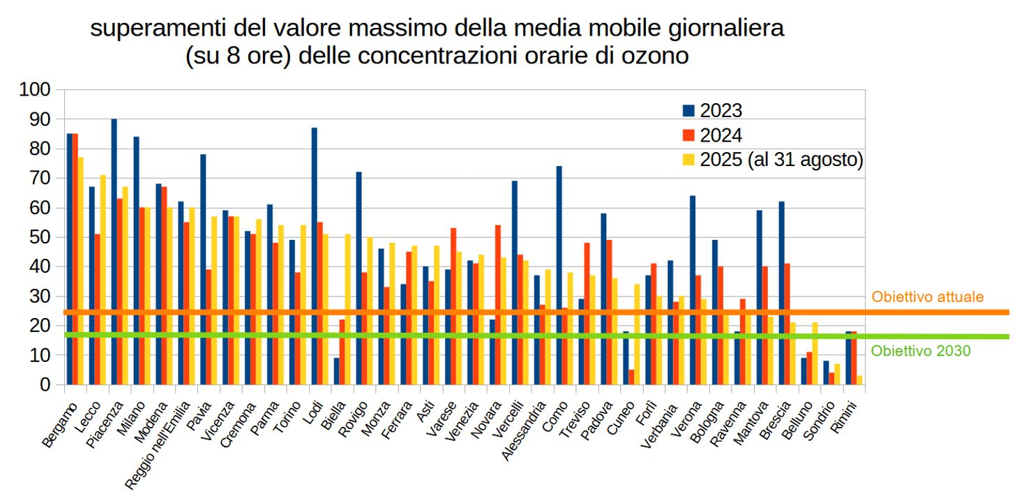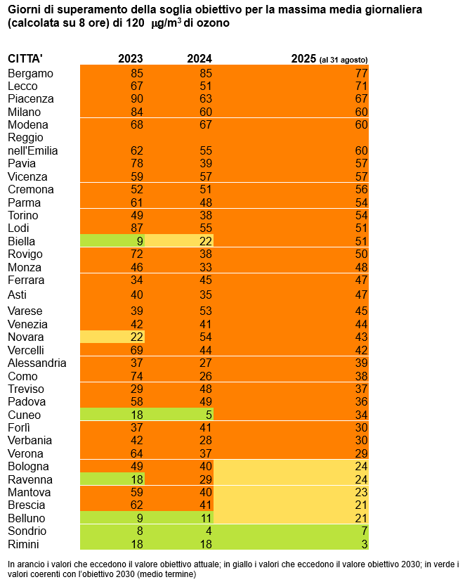 Per quanto riguarda gli episodi più acuti, con superamento della soglia di informazione (180 mg/m3 come media oraria), questi hanno riguardato 27 dei 36 capoluoghi delle 4 regioni. Bergamo resta la città che ne ha subito in maggior numero (ben 72 fino al 31 agosto 2025), ma i capoluoghi colpiti con maggiore frequenza sono tutti quelli della Lombardia Occidentale (Bergamo, Lecco, Milano, Varese, Pavia, Monza, Cremona, Como e Lodi), insieme a quelli delle confinanti province emiliane (Piacenza, Modena, Parma e Reggio) e piemontesi (Novara e Asti). Si segnalano anche episodi di superamento della soglia di allarme (a Pavia e in alcuni centri del Milanese). Una fotografia impietosa, considerando anche che l’estate appena trascorsa, con l’eccezione del mese di giugno, non è stata particolarmente favorevole ai fenomeni di smog fotochimico come era avvenuto nei siccitosi anni 2022 e 2023.