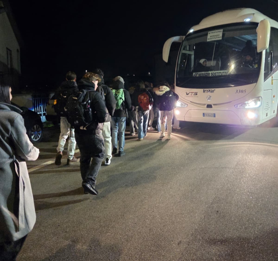 Studente pavesi salgono sul bus sostitutivo per Pavia a causa del cambio di orario sulla linea ferroviaria Stradella-Pavia-Milano. Stazione ferroviaria di Bressana Argine, Bressana Bottarone (PV) il 15 dicembre 2025 alle 6:56 (ph.: Legambiente Lombardia)
