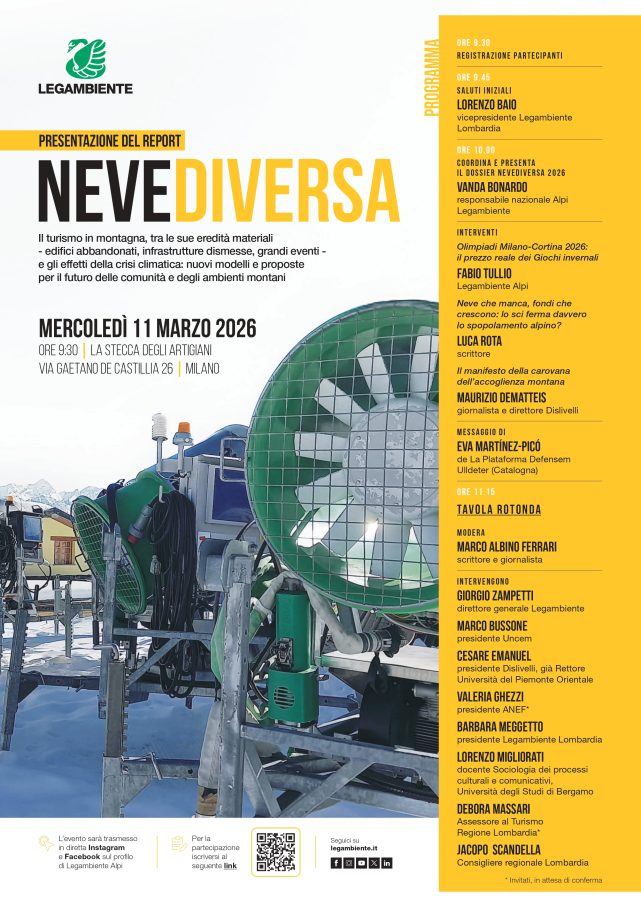 Presentato oggi a Milano il dossier nazionale Neve Diversa 2026, con numerosi approfondimenti sulla realtà lombarda. Manca un’attitudine alla riconversione del turismo, ancora troppo alti gli investimenti in località con innevamento instabile. Dati demografici in calo nelle aree montane, a sottolineare la mancanza di stili di vita alternativi per le comunità. Olimpiade Milano Cortina: emergono extra costi e impatti ambientali importanti per un evento che si presentava “low cost e sostenibile”.