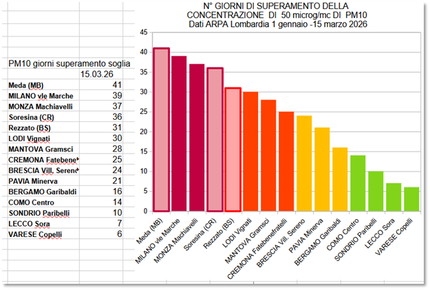 Un inizio d’anno difficile quello della Lombardia, stando ai dati sull’inquinamento da polveri sottili (PM10). Quasi tutti i valori delle centraline di misura di ARPA sono in deciso peggioramento rispetto allo stesso periodo dello scorso anno. Pesa di certo l’andamento meteorologico, soprattutto delle ultime settimane, ma i dati confermano il contributo sempre più rilevante delle emissioni da allevamenti, da combustione di biomasse legnose e soprattutto da traffico veicolare motorizzato, come testimonia il dato della centralina di Milano-Viale Marche, sulla trafficatissima circonvallazione della città di Milano, che a fine inverno ha totalizzato già 39 giornate di superamento della soglia di esposizione acuta, in pratica aria tossica per più di un giorno ogni due, collocando il capoluogo lombardo tra le località ‘fuori legge’.