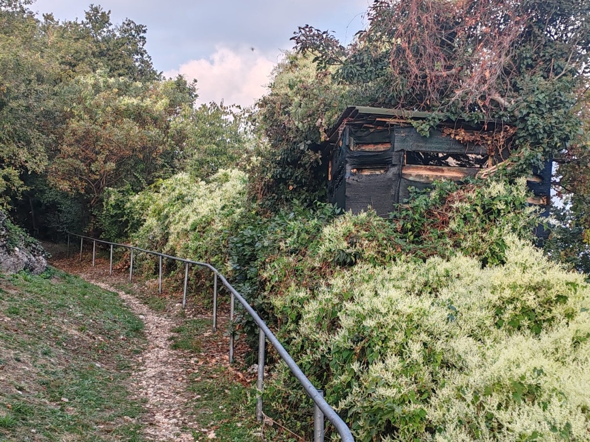 Percorso pubblico con corrimano per non vedenti e persone con disabilità in un parco comunale, sulla destra una struttura usata come punto per la caccia agli uccelli con affaccio anche sul sentiero.
